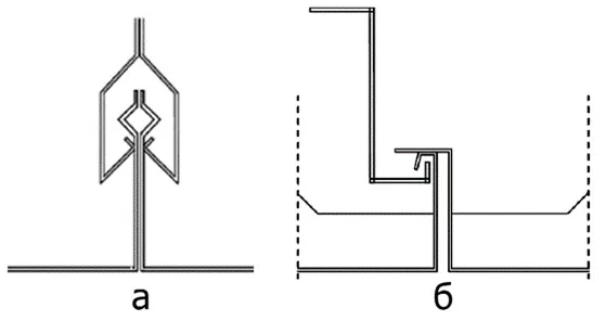 Рисунок 17. Варианты скрытых креплений: клеммовая (защелкиваемая) потолочная система clip-in (а) и навешиваемая потолочная система hook-on (б).