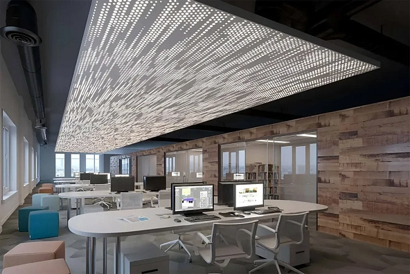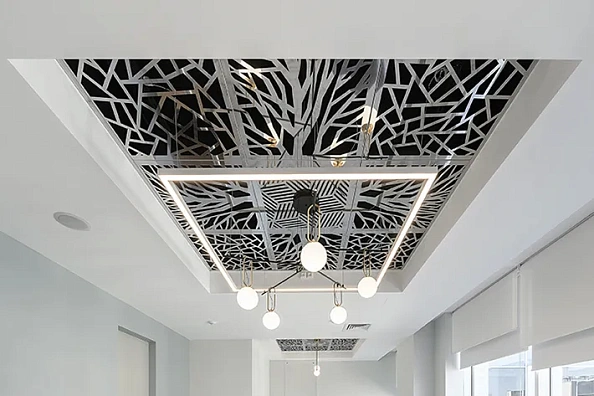 Кроме грильято, похожий визуальный эффект полупрозрачной «сетки» можно создать с использованием кассет с перфорацией. Функционально такой потолок тоже близок к грильято — свободно пропускает воздух, легко монтируется и демонтируется, устойчив при перепадах температур и высокой влажности.