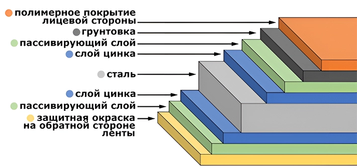 Схематическое изображение «бутерброда», сочетающего различные виды покрытия стальной полосы показано на рисунке 2. Такой «комбинированный» штрипс состоит из слоёв: сталь → слой цинка → пассивирующий слой → грунт → полимер.