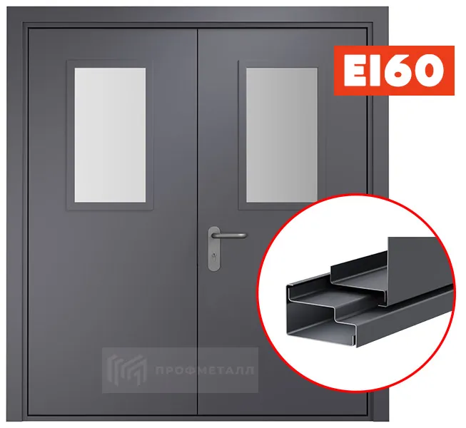 Дверь стальная ДПМ EI-60 двупольная с остекленением до 25% и порогом высотой 55 мм, термоактивной лентой и двумя контурами уплотнения, обеспечивающими плотный притвор.