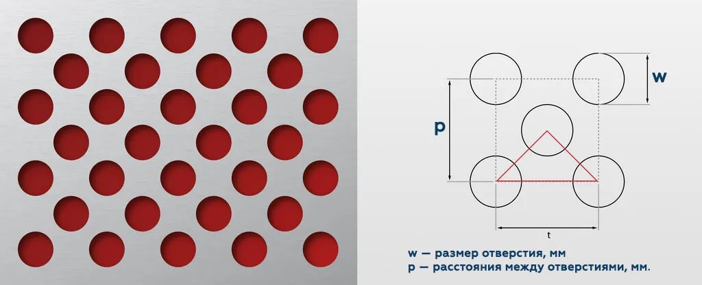 Лист перфорированный Rd 2-8,5 ― металлический лист с круглыми отверстиями диаметром 2 мм, расположенными в виде смещенных рядов с межцентровым расстоянием отверстий 8,5 мм.